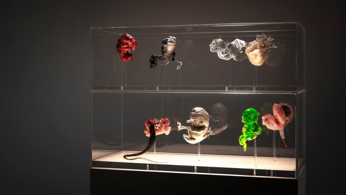 Image: Clare Nicholson. Normentafel of Contemporary Environmental Anxieties, (detail). (2018). Anatomical wax, cement, grey pigment, metal wire, polymer clay, resin, dead coral, porcelain, human hair, aluminium, hardware, metal, perspex, LED, lime-washed plinth. H165 x W65 x D27cm. Photo credit: Greg Piper