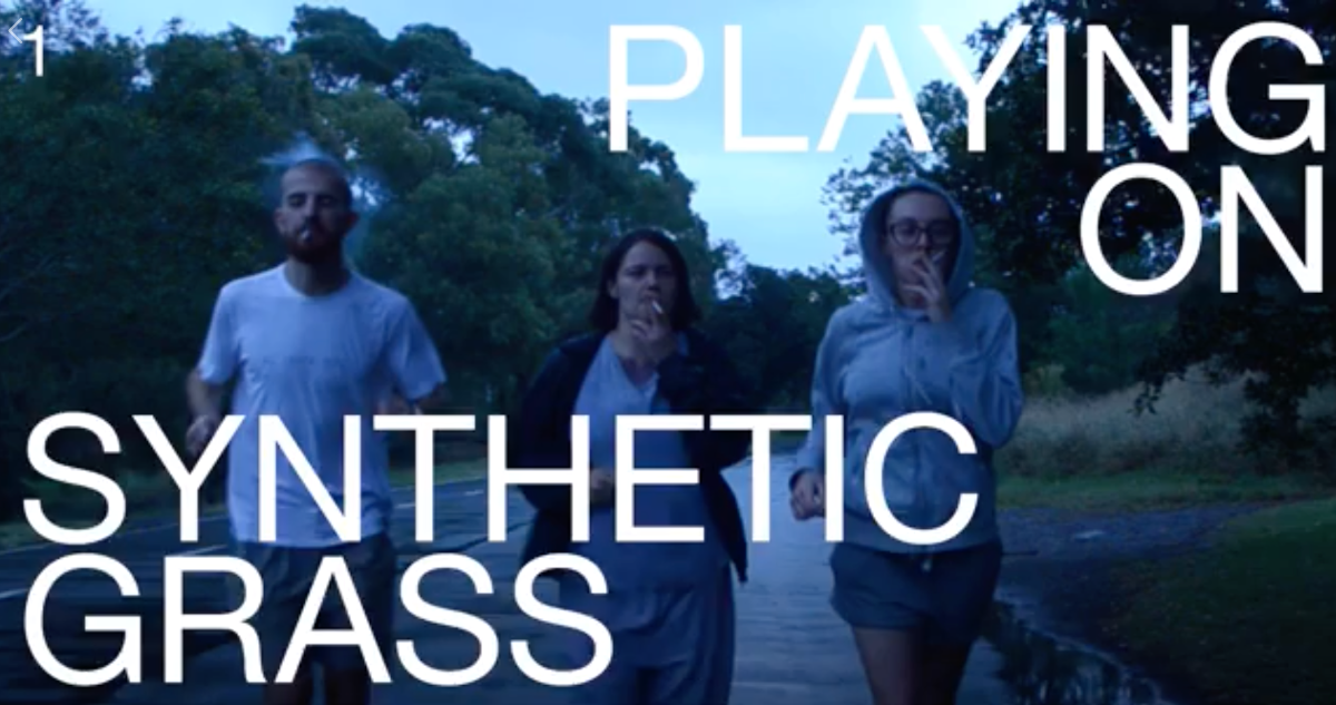 When Playing on Synthetic Grass, we are in our element, in the playground, the artificial space that looks nothing like the real world, but is designed to be safe. A space for experimentation, learning and growth. We don't work, we play, and we don't make works, we make games. Playing on Synthetic Grass brings us back to our childhood, the playgrounds, the playpens and the various play things. The world around us is forgotten as we reimagine our inconsequential childhood through the bizarre fantasy of this hyperreal synthetic material.