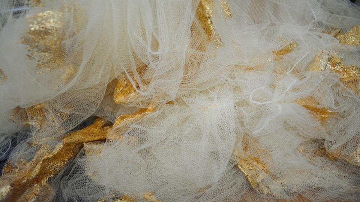 Image: Linda Sok, Soft Monument (detail) (2019) mosquito nets, gold leaf, metal, string. Installation dimensions variable. Image courtesy the Artist.