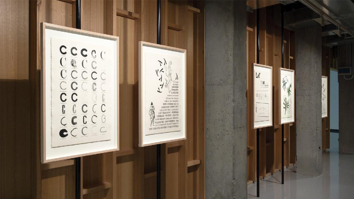 Image: Ella Sutherland Five Readings, 2018, silkscreen on paper, 5 parts: each 76.2 x 55.8cm (sheet). Installation view, Monash University Museum of Art, Bookworks, Melbourne, 2019. Photo: Christian Capurro. Courtesy of the artist.